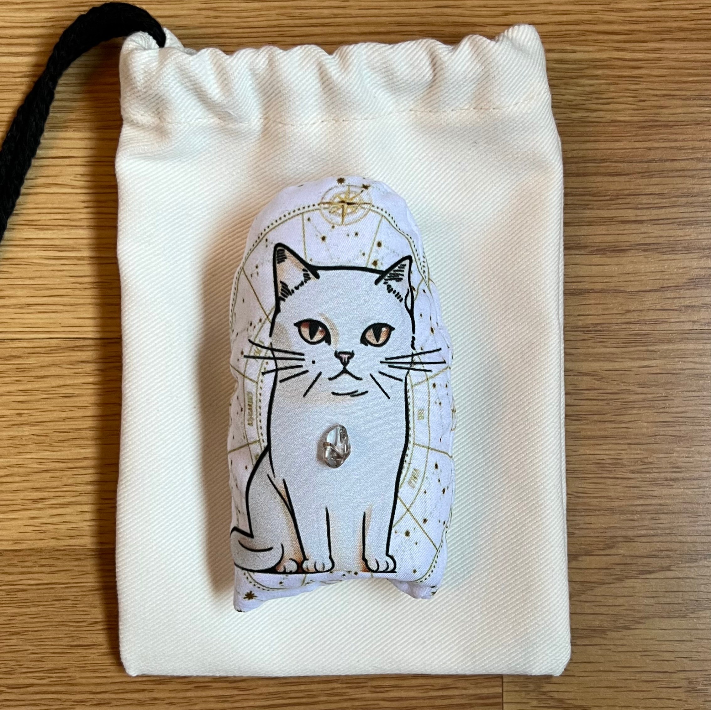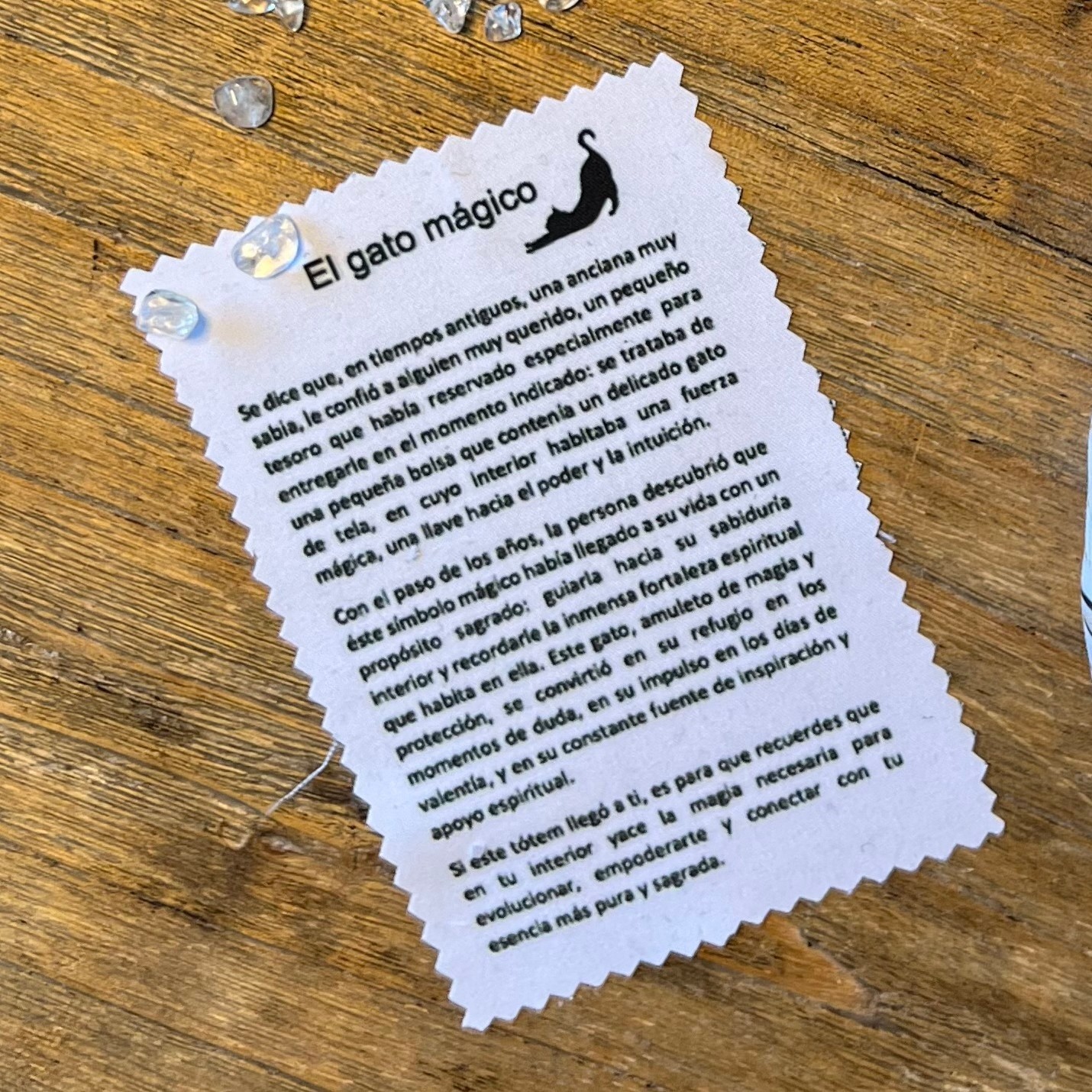 Amuleto de tela con diseño original gatuno creado con cristales en su interior // Viene en bolsa de gabardina de algodón para su guardado. Contiene un gatito de 13 cm x 8 cm + cristal + leyenda en tela de este tesoro.