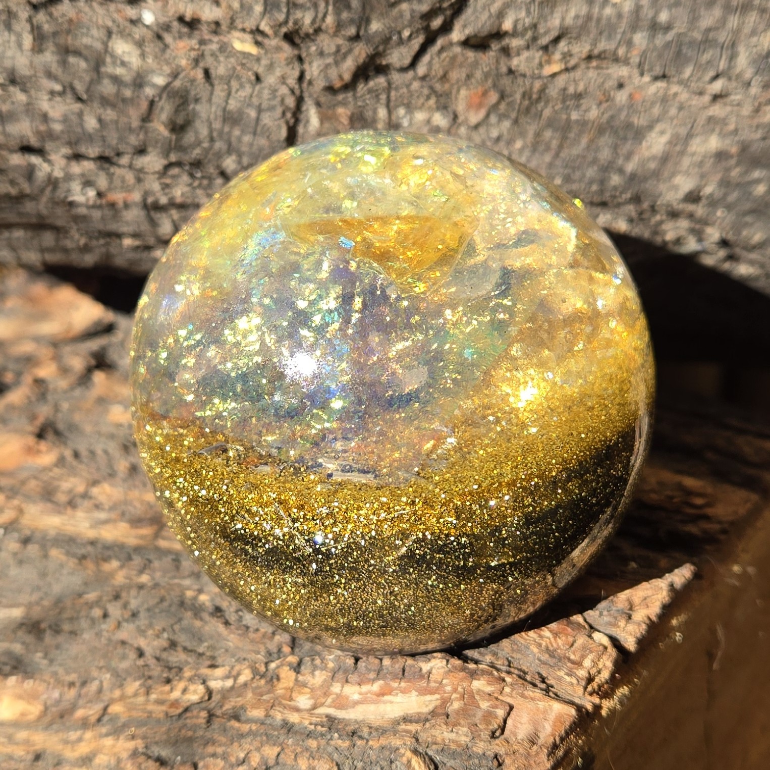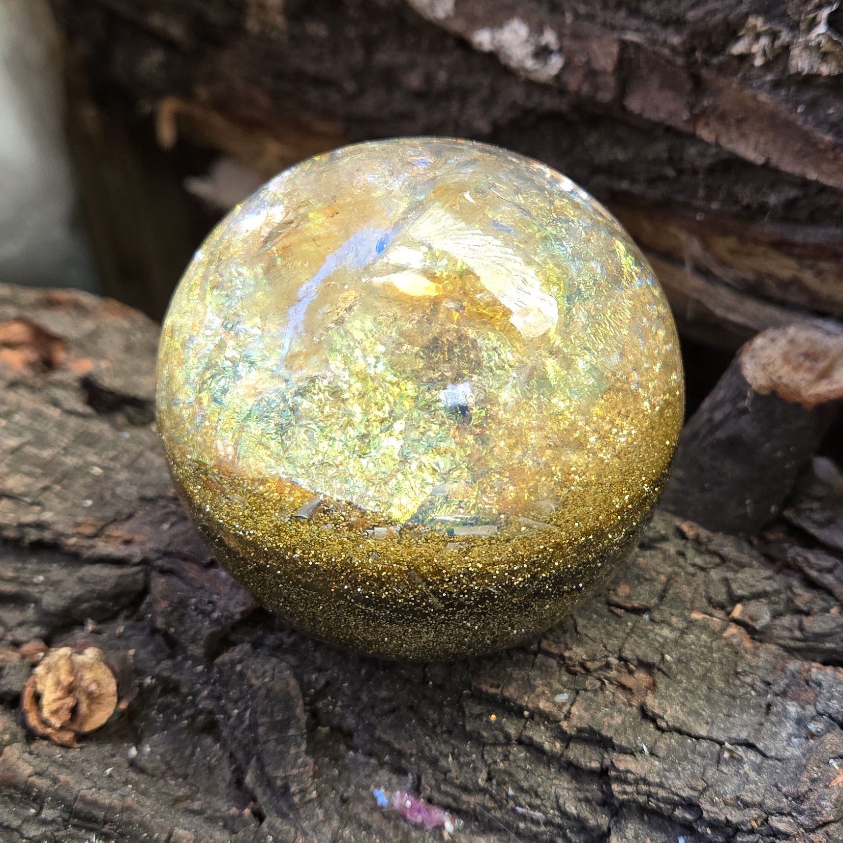 Confeccionado con orgón: resina, metal aluminio y cristales.