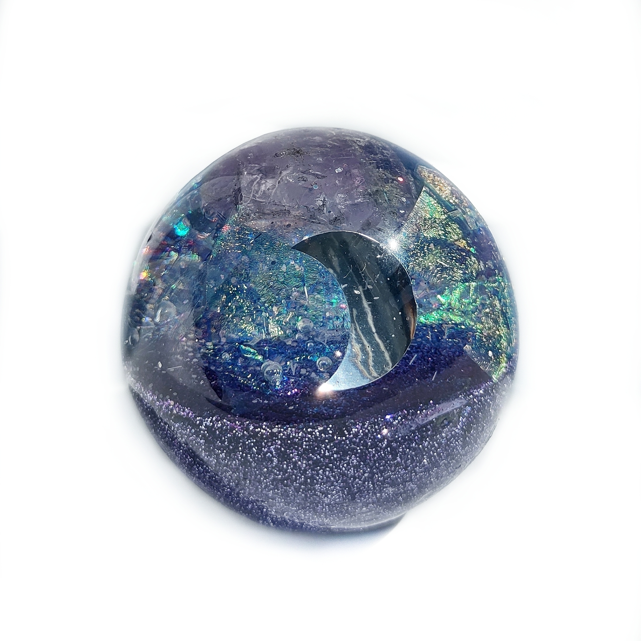 Confeccionado con orgón: resina, metal aluminio y cristales.