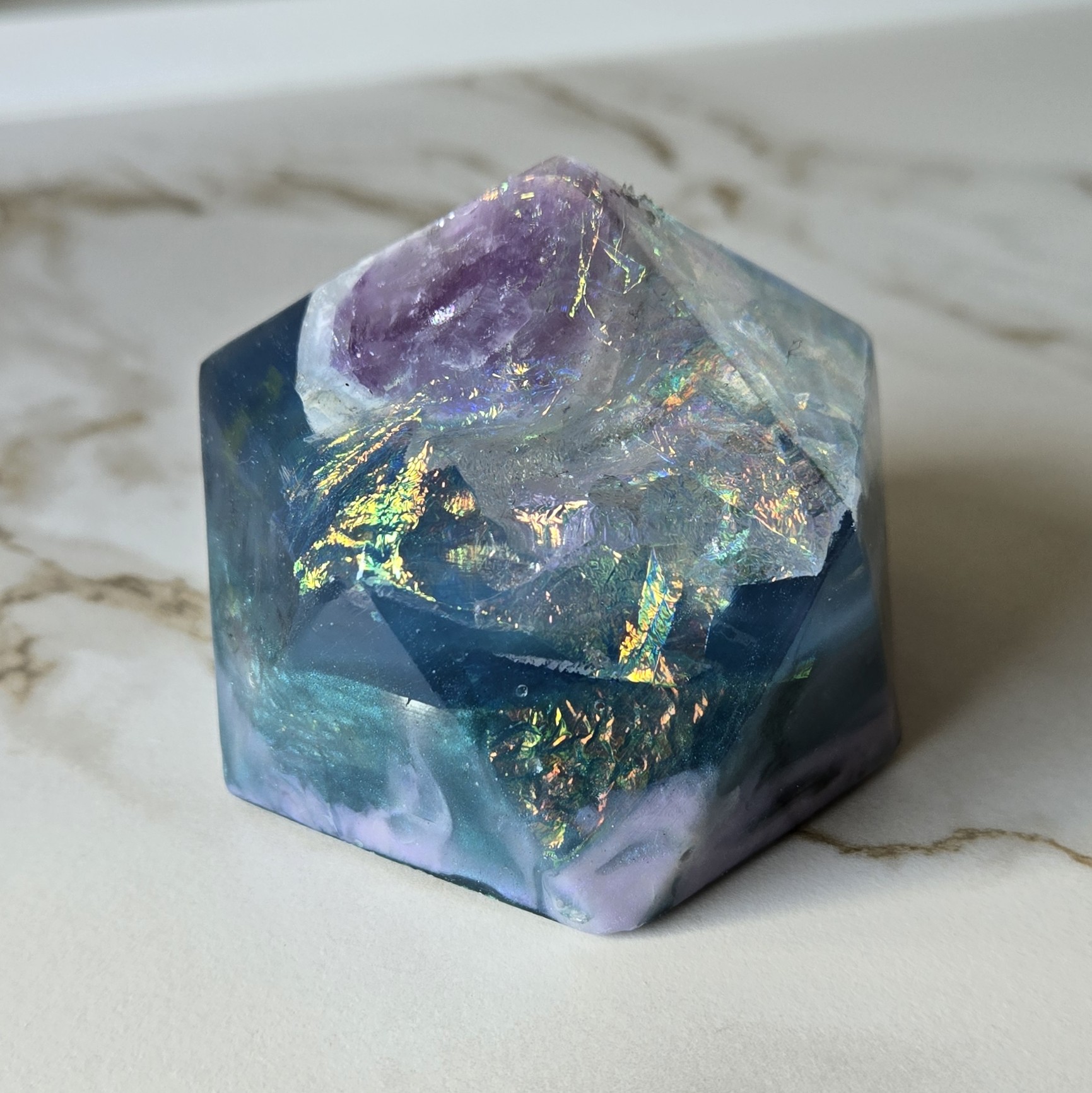 Pieza octogonal confeccionada con orgón: resina, metal aluminio y cristales.