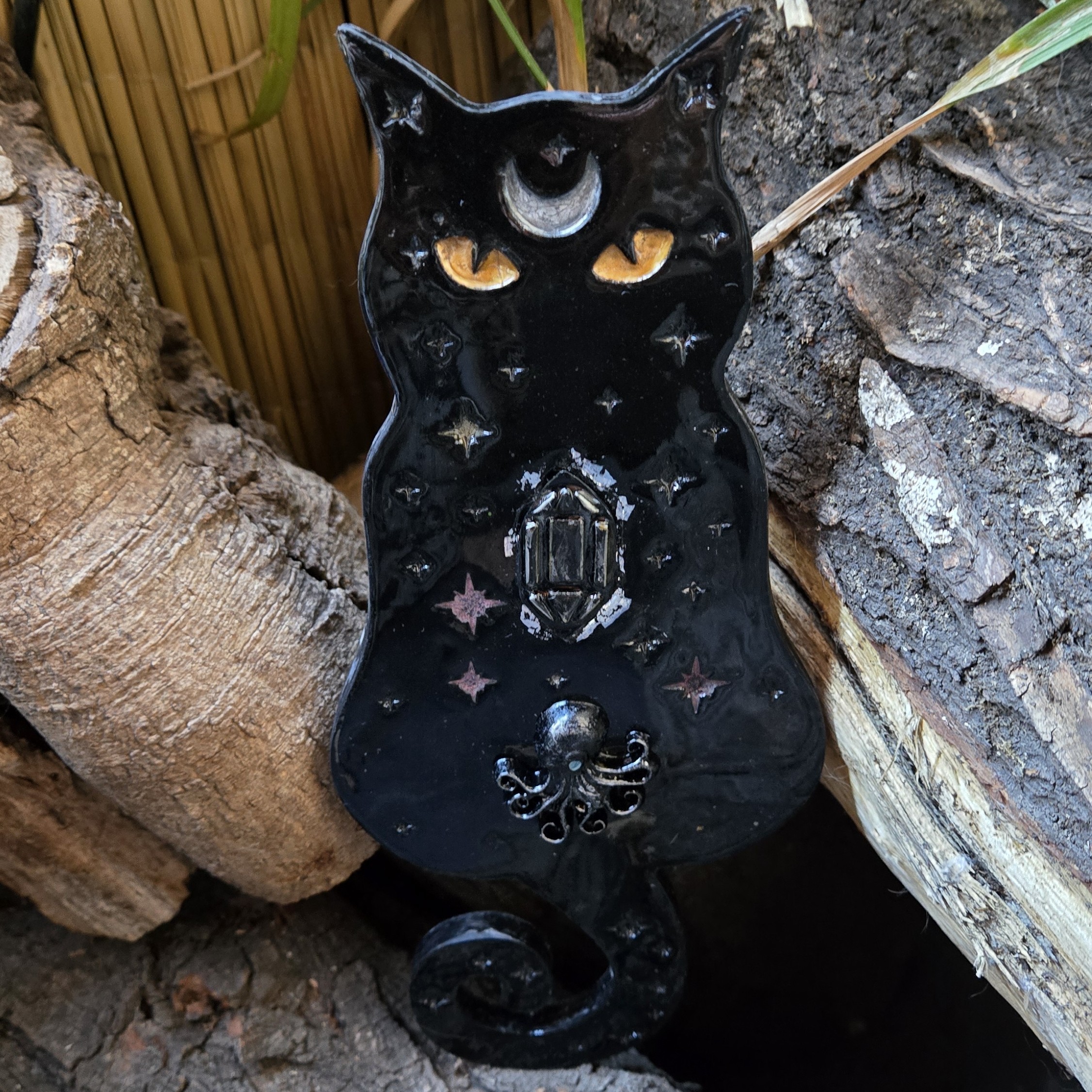 Pieza hecha a mano con forma de gato creada con orgón (cristales, metal, y resina). Ideal para transmutar densidad energetica de espacios sociales. Podés apoyarla o colgarla.