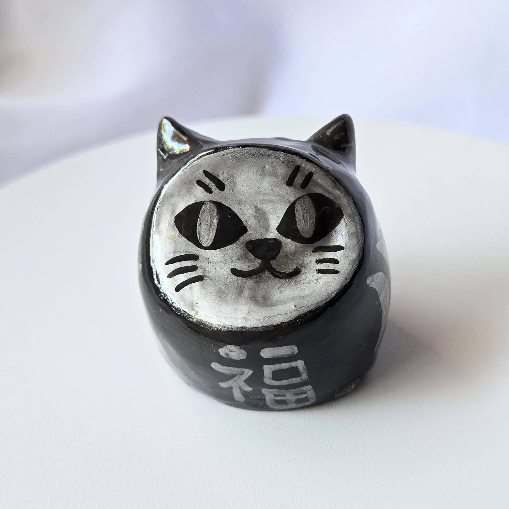 Los daruma son amuletos japoneses de buena suerte, perseverancia y logro de metas. Vienen con una tarjeta con los ojos en blanco: cuando alguien se fija una meta o deseo, pinta un ojo; y cuando se cumple, se pinta el otro. En este caso tendrán doble poder porque son daruma gatos, e invocan a los dioses terrestres más amados.