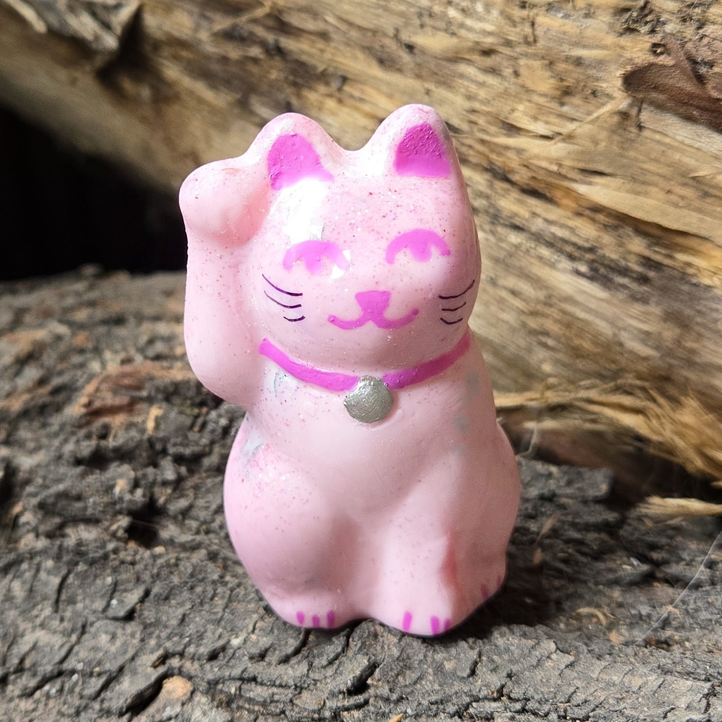 Gato confeccionado con orgón: resina, cristales y metal acero.