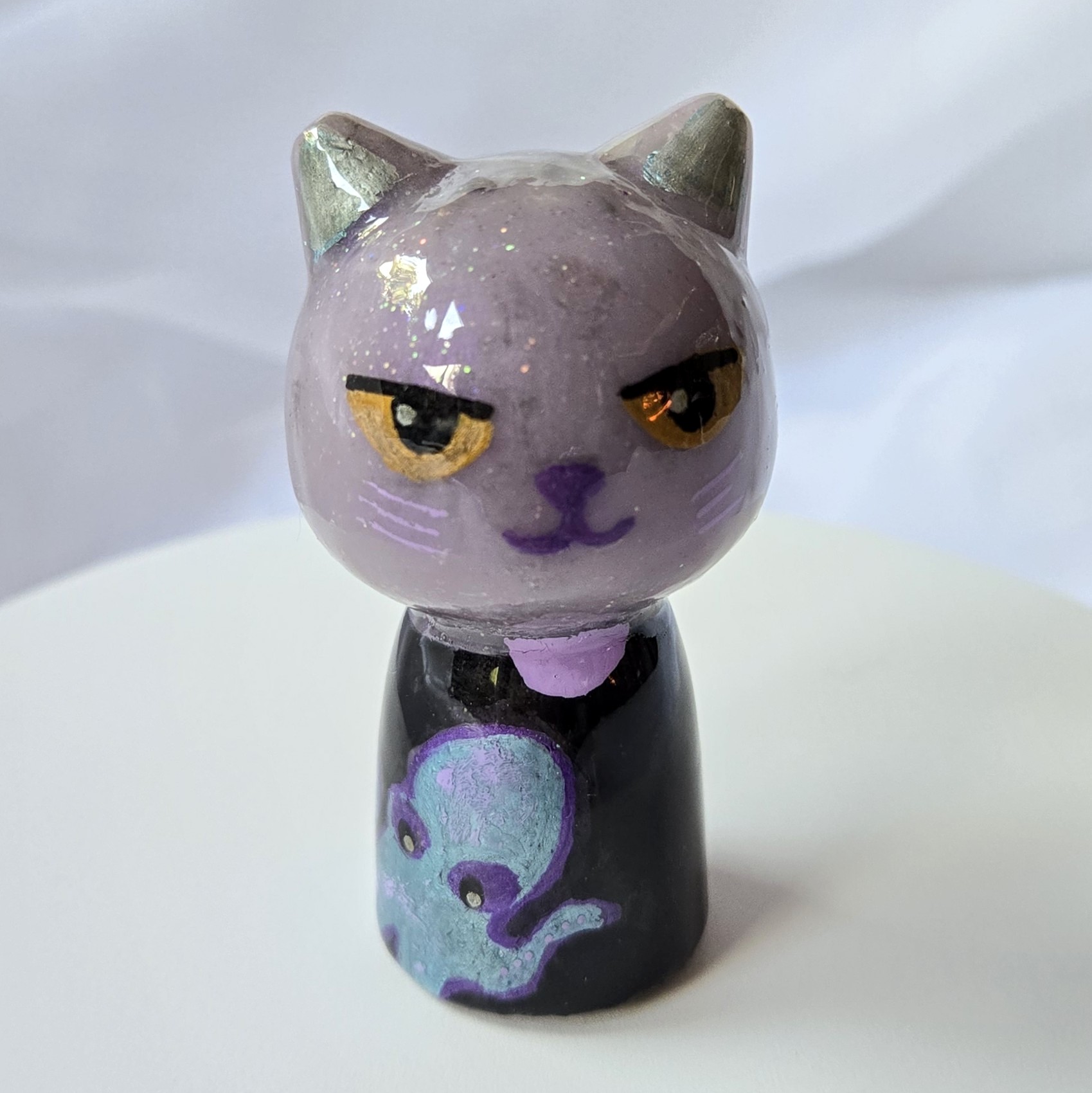 Las kokeshi aparecen en Japón hacia fines del período Edo, en Tōhoku, como figuras de madera simples pensadas como souvenirs y también como objetos para niños. Cuerpo mínimo, cabeza grande: una forma donde la atención va directo a la mente y a la presencia. Con el tiempo surgen las neko kokeshi, una versión contemporánea que aporta la energía del gato, asociada a protección y buena fortuna en el hogar. Hoy, en cualquiera de sus formatos, funcionan como amuletos: cuidan el espacio y atraen los buenos pensamientos. Creadas con orgón en variedad de cristales que transmutan la densidad energetica de tu hogar y demás lugares