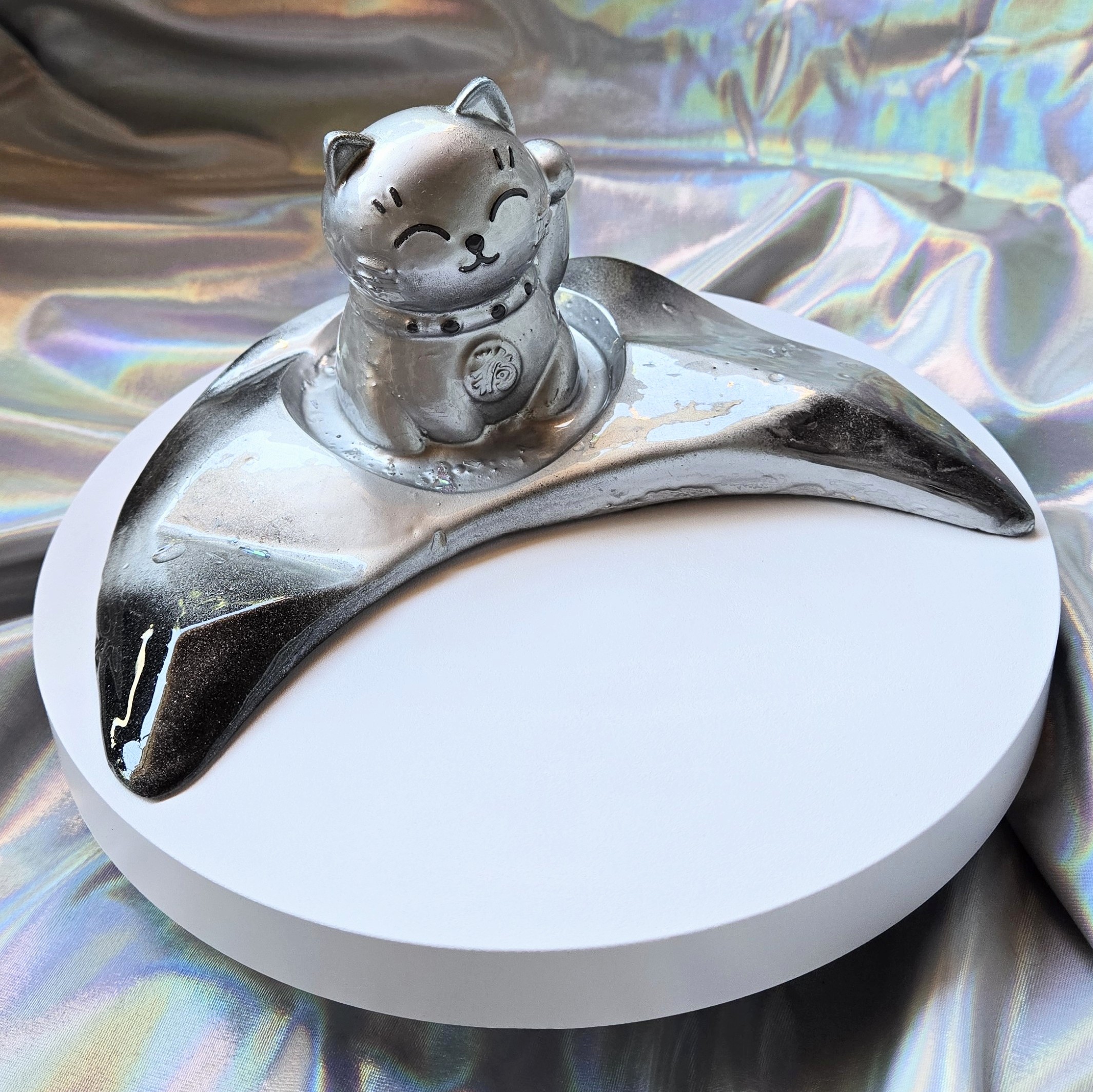 Confeccionado con orgón: resina, metal aluminio y cristales.