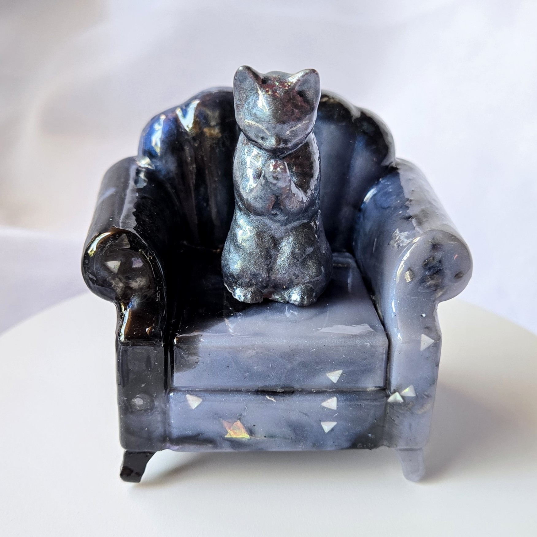 Sofa con gato meditando creado con orgón: metal, cristales y resina.