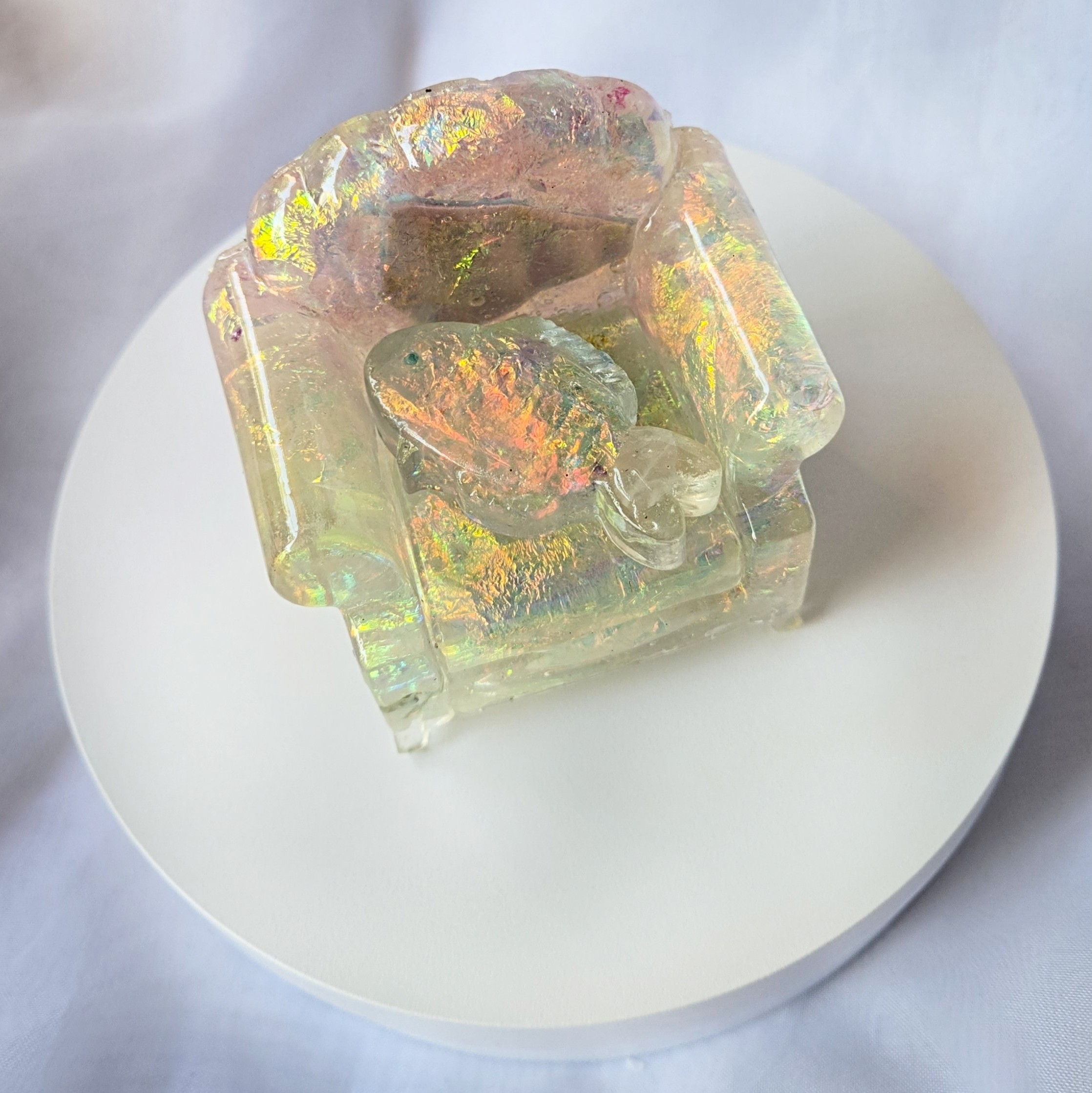 Sofa con gato meditando creado con orgón: metal, cristales y resina.