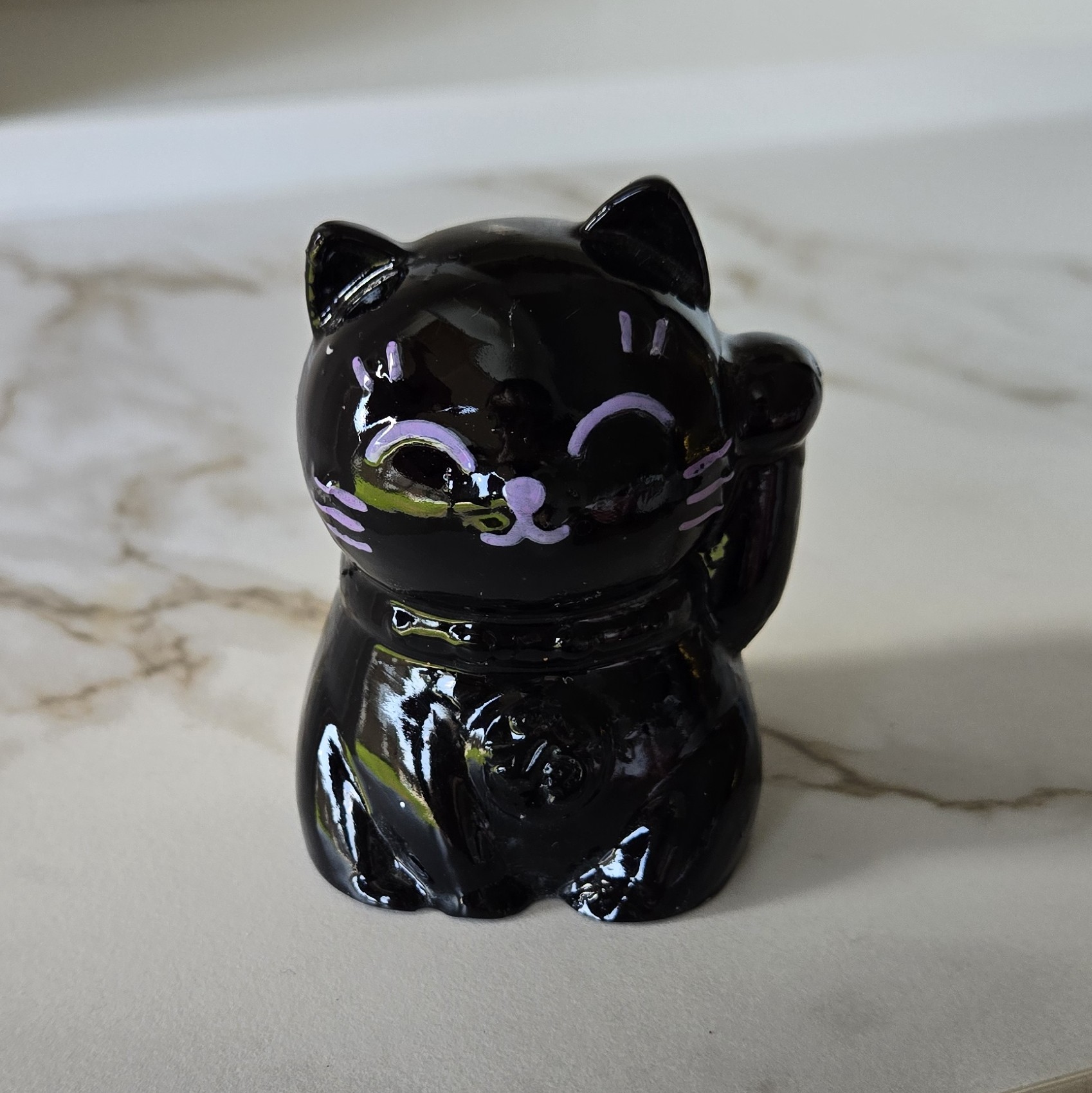 Gato de la suerte confeccionado con orgón: resina, metal aluminio y cristales.