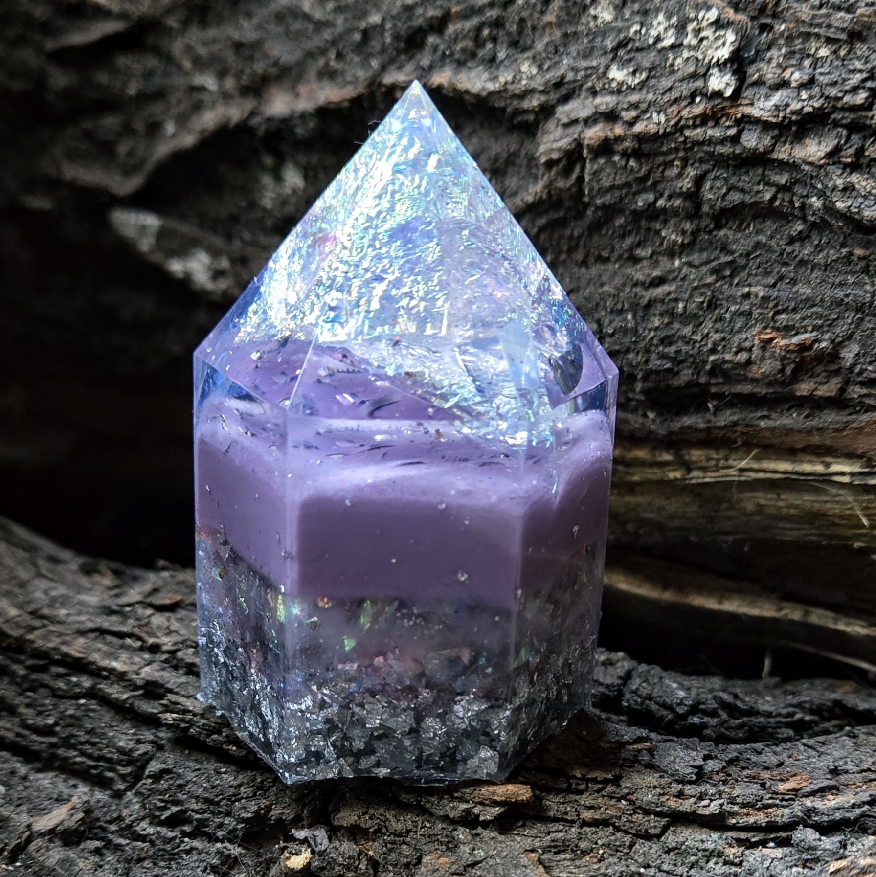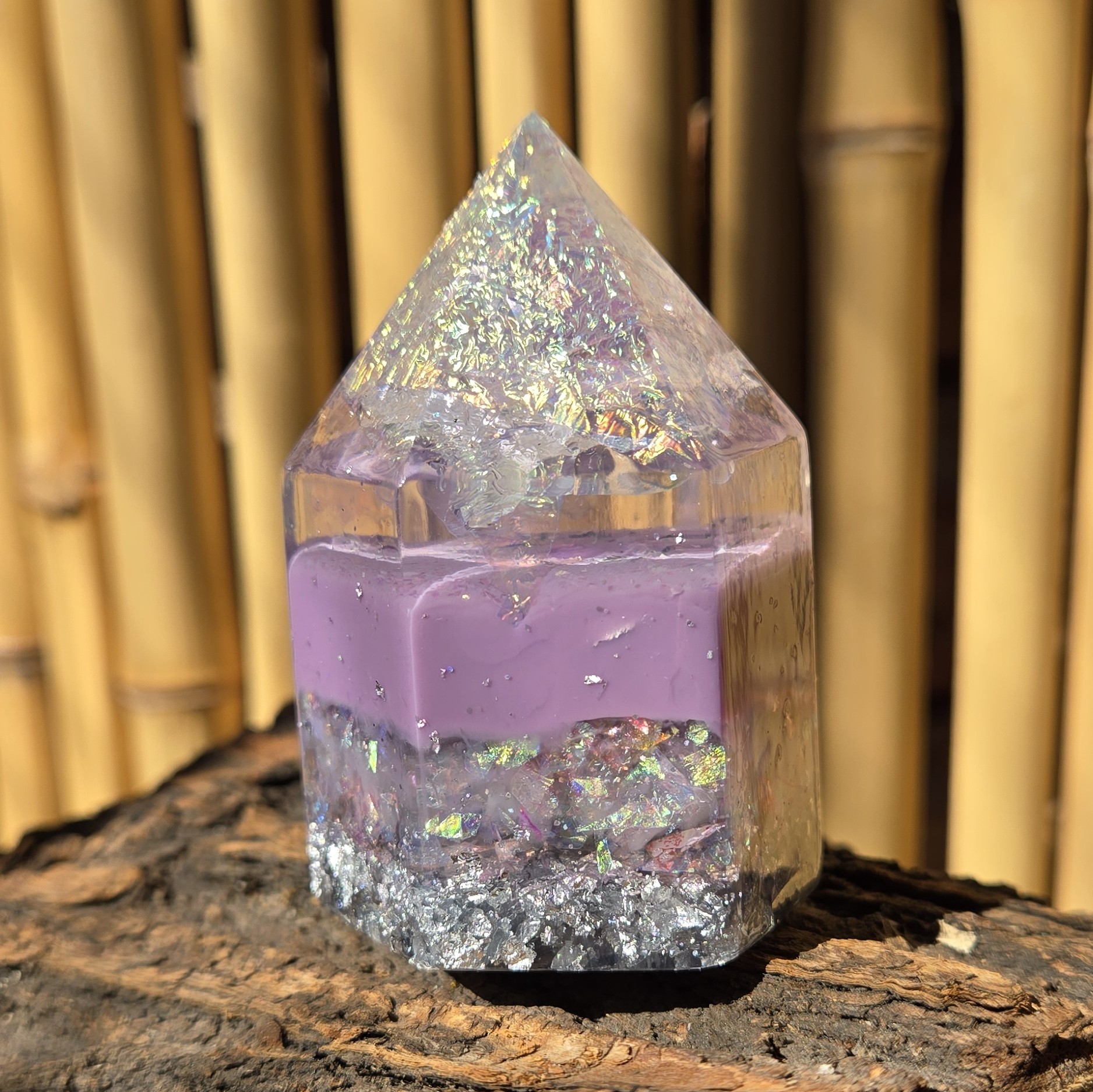 Confeccionado con orgón: resina, metal aluminio y cristales.