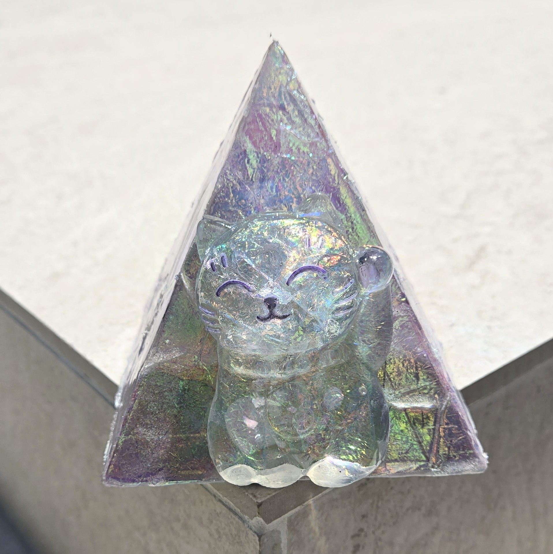Pirámide confeccionada con orgón: resina, metal aluminio y cristales.