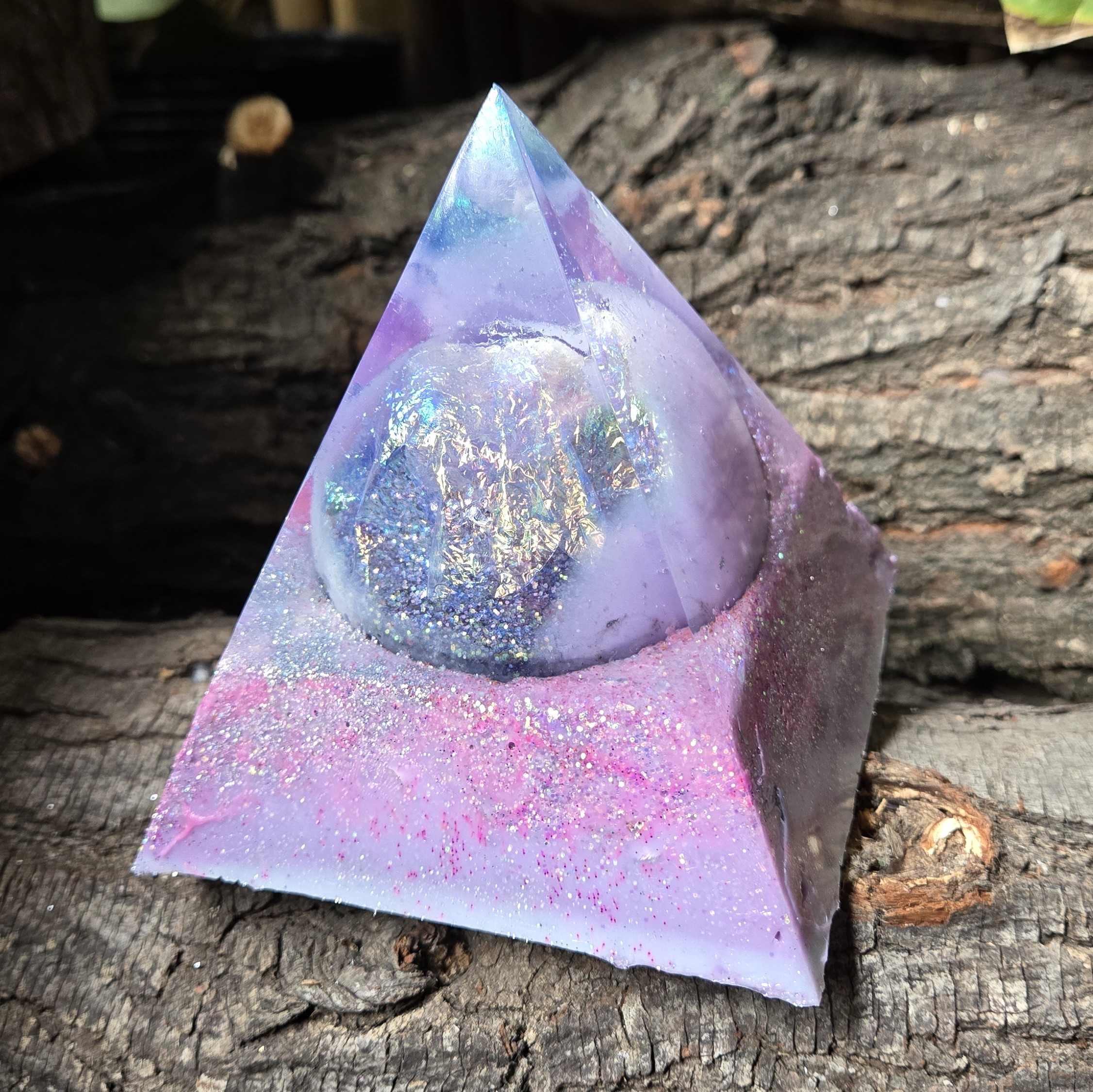 Confeccionado con orgón: resina, metal aluminio y cristales.