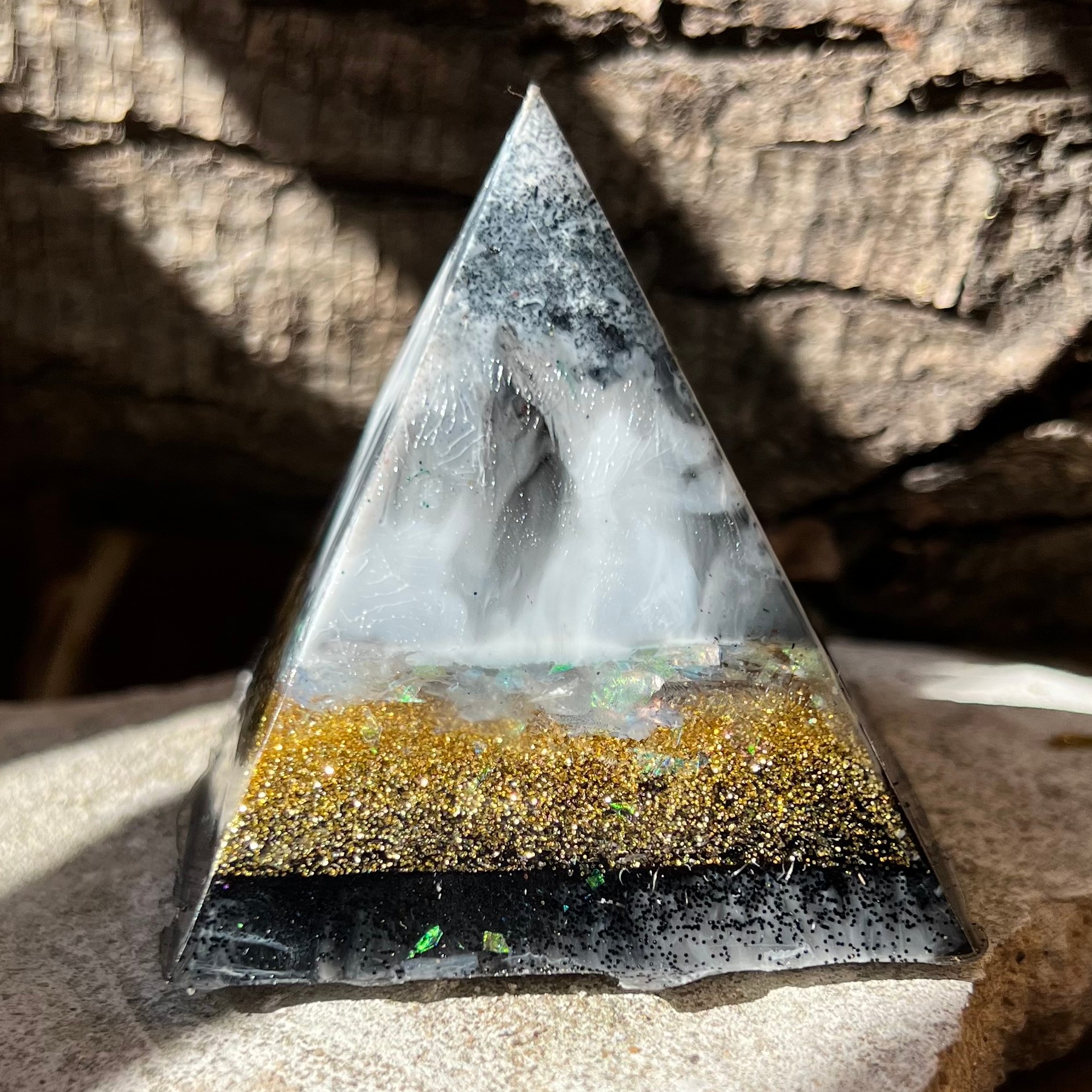 Confeccionado con orgón: resina, metal aluminio y cristales.