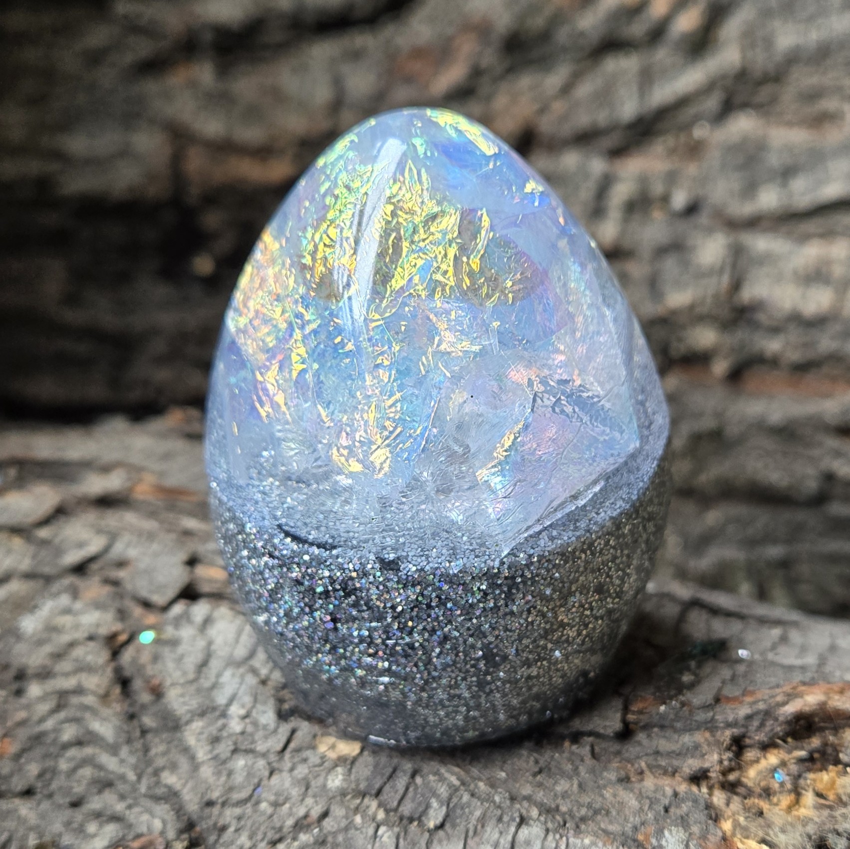 Huevo confeccionado con orgón: resina, cristales y metal acero.