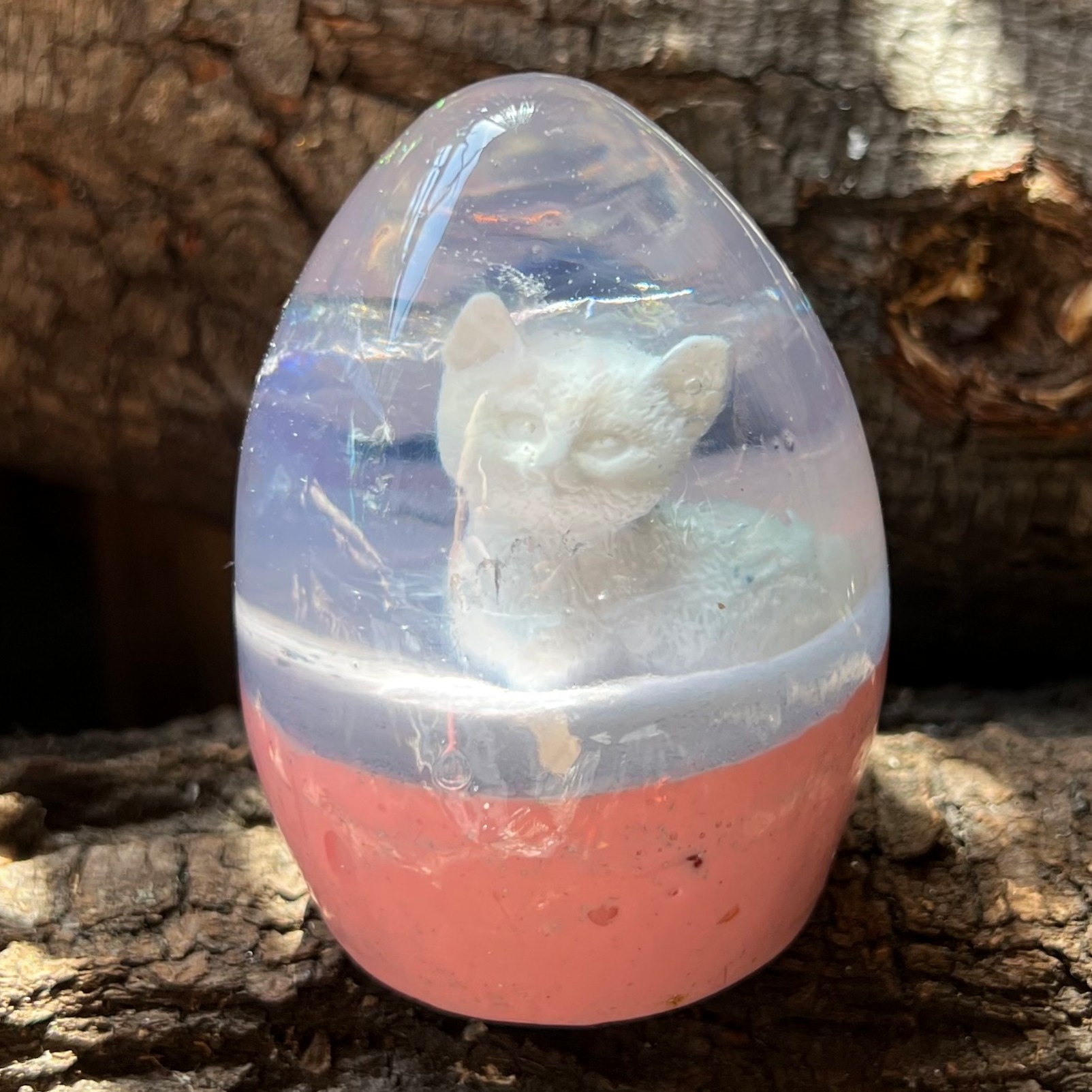 Huevo confeccionado con orgón: resina, cristales y metal acero.
