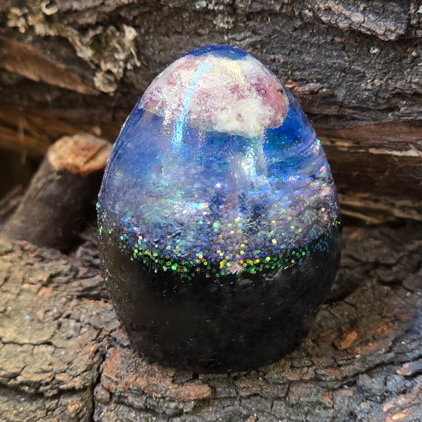 Huevo confeccionado con orgón: resina, cristales y metal acero.