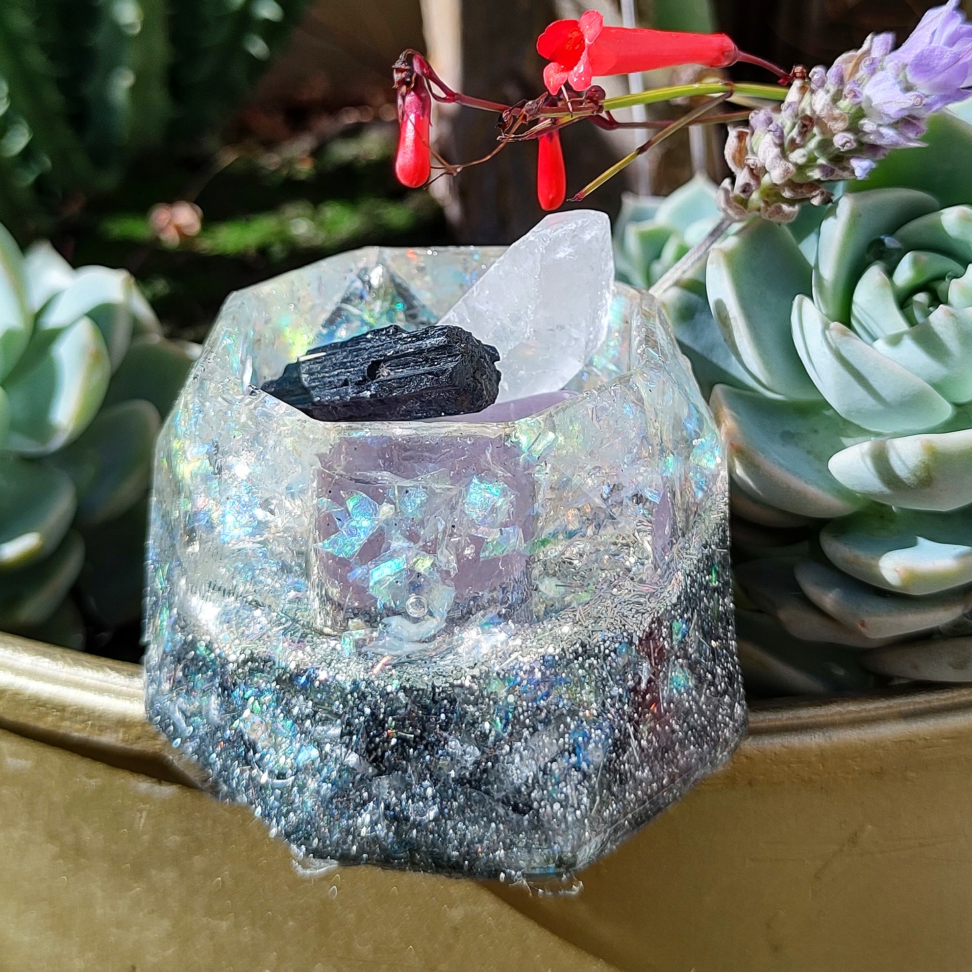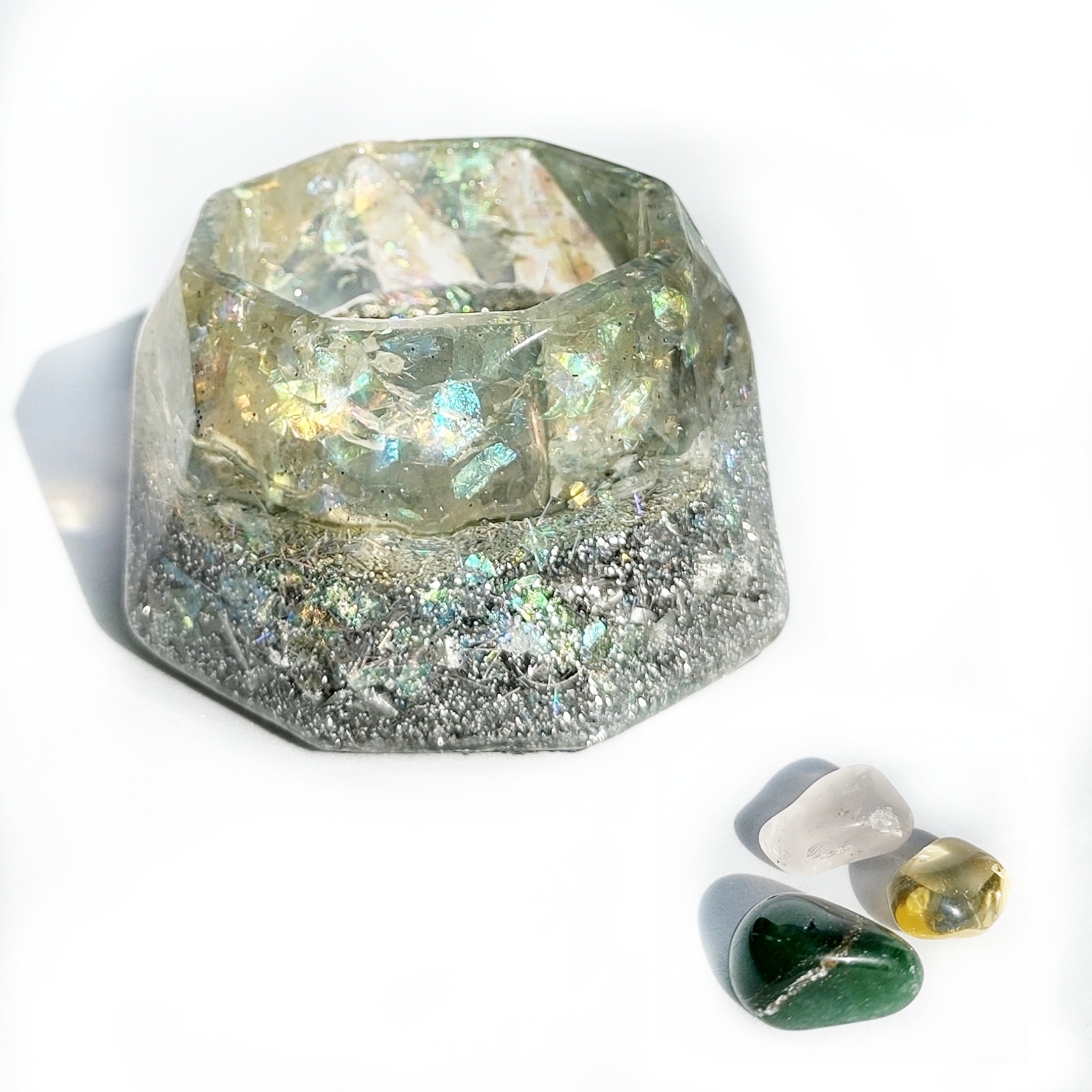 Caja confeccionada con orgón: resina, metal aluminio y cristales.